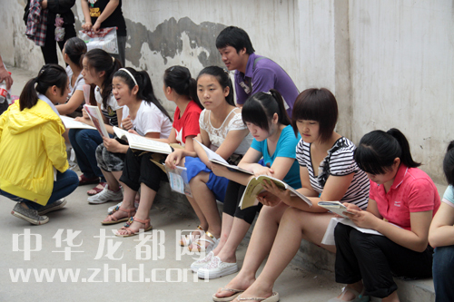 考生等待進(jìn)場(chǎng)前許多學(xué)生突襲溫習(xí)