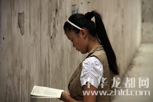 開考前一名女學(xué)生還在溫習(xí)課文。(戚永/攝)