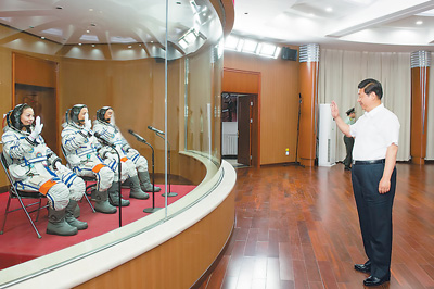 ?。保窌r許,習(xí)近平來到距發(fā)射塔1500米的測發(fā)指揮樓指揮大廳,看望前指參試人員,同大家握手問候。隨后,習(xí)近平走出測發(fā)指揮樓,遠(yuǎn)眺發(fā)射塔架,詳細(xì)了解神舟十號飛船發(fā)射前的測試準(zhǔn)備情況。