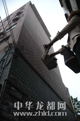 ????昨日,記者來到周口市區(qū)七一路與工農(nóng)路交叉口西側(cè)的周口市工信局辦公樓。記者注意到,這是一棟臨街樓,其中一樓、二樓是一家正在營業(yè)的藥店。樓東面是一條胡同,穿過胡同是周口市工信局家屬院。這條胡同是居民們進(jìn)出的唯一通道,脫落水泥塊的地方就是胡同的正上方的樓頂。記者看到,接近樓頂?shù)耐鈮ι希偳吨鴥尚兴嘀谱鞯难b飾物。脫落的水泥塊就來自這種裝飾物。