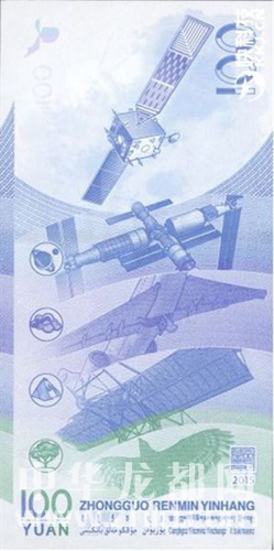 中國航天紀(jì)念鈔面額為100元,票面長155毫米,票面寬77毫米,中國航天紀(jì)念鈔主色調(diào)為藍(lán)色。正面主景圖案為神舟九號飛船與天宮一號交會對接圖案。左上方為國徽圖案、“中國人民銀行”行名,其下方為東方紅一號衛(wèi)星圖案。票面左下方為面額數(shù)字“100”和漢字“壹佰圓”。主景圖案右側(cè)為嫦娥一號衛(wèi)星圖案,其上方為面額數(shù)字“100”和“中國航天紀(jì)念”字樣。背面主景圖案由上至下依次為嫦娥一號衛(wèi)星圖案、2020年中國空間站“天宮”、噴氣式客機(jī)、馮如2號雙翼螺旋槳飛機(jī)、飛禽海東青圖案。票面左上角為風(fēng)箏局部圖案,右上角為面額數(shù)字“100”。票面下方為行長章與年號“2015”,中國人民銀行漢語拼音字母和蒙、藏、維、壯四種民族文字的“中國人民銀行”字樣與面額,面額數(shù)字“100”,漢語拼音字母“YUAN”。