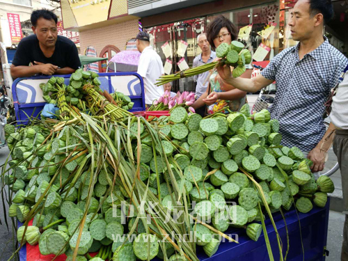 ????7月25日上午,在周口中心城區(qū)六一路上,一些流動(dòng)攤販正在販賣荷花、蓮蓬,縷縷清香沁人心脾,引得不少市民爭(zhēng)相購(gòu)買。晚報(bào)記者 朱海龍 攝