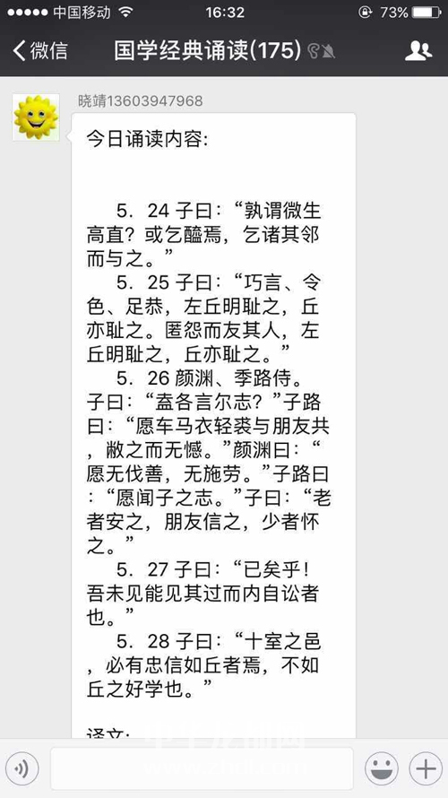 ????建立該微信群的是團(tuán)市委工作人員劉曉靖。劉曉靖告訴周口晚報記者,建立該微信群的目的是想讓大家多讀讀國學(xué)經(jīng)典,增加大家的文學(xué)涵養(yǎng),讓大家養(yǎng)成讀書的習(xí)慣?!皠傞_始只有十幾個人,大家有些不好意思,有的人覺得自己讀得不好張不開口,我就做一些示范,引領(lǐng)大家誦讀。不久,加入微信群的人多了,通過幾個人帶動,大家誦讀的就多了?!眲跃刚f,讀的方式就是大家通過微信的語音功能,讀一些《論語》中的經(jīng)典句子。過了一段時間,大家對這種方式越來越認(rèn)可,加入該微信群的人也越來越多,人數(shù)從剛開始的十幾個人增加到近200人?,F(xiàn)在,該微信群里不但有電臺、電視臺的專業(yè)主持人,而且有一些學(xué)者。以前拿不準(zhǔn)的字,現(xiàn)在都會有人講解,大家也有了學(xué)習(xí)對象。這個微信群從成立到現(xiàn)在,《弟子規(guī)》、《大學(xué)》、《中庸》、《論語》已讀一遍,四書里面只剩下《孟子》還沒有讀。
