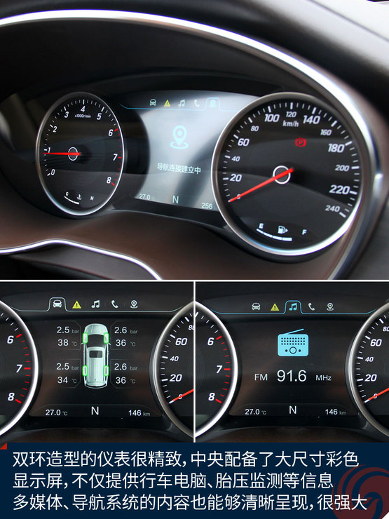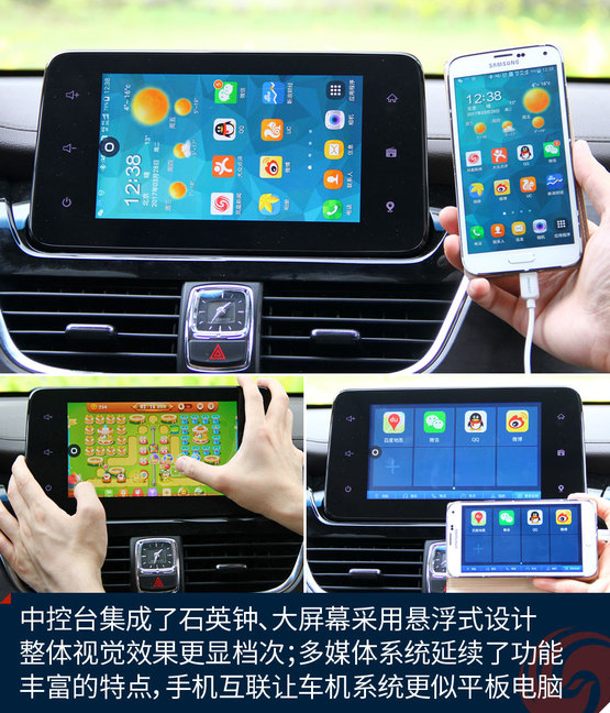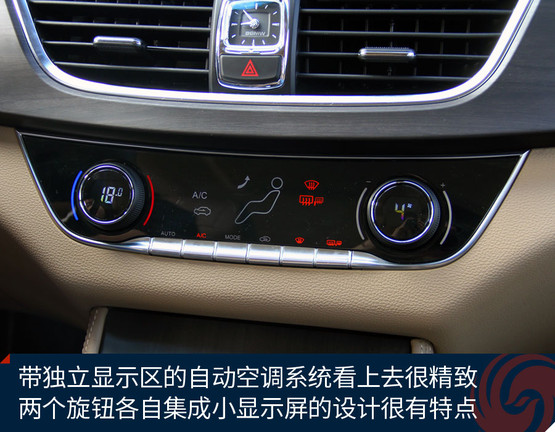 中控臺中央的大尺寸液晶屏顯示效果挺贊,高清屏、亮度高、色彩艷麗,功能上也足夠強大,收音機、藍(lán)牙免提、影音播放、GPS導(dǎo)航等等非常全面,前后雷達(dá)、360全景影像也能夠在這里清晰顯示,只可惜手機互聯(lián)僅支持安卓系統(tǒng),希望日后能有所完善。下方的自動空調(diào)控制區(qū)很精致,也很顯檔次。