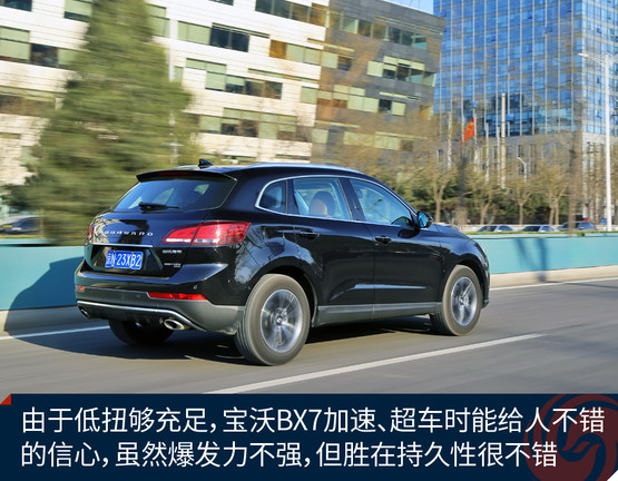 動(dòng)力方面寶沃BX7擁有一臺(tái)2.0T渦輪增壓直噴發(fā)動(dòng)機(jī),目前在售的均為高功率版本,擁有165千瓦的最大功率和300牛頓·米的峰值扭矩,這臺(tái)2.0T發(fā)動(dòng)機(jī)是寶沃聯(lián)合德國(guó)FEV公司共同研發(fā),最大功率數(shù)據(jù)可觀,但峰值扭矩因?yàn)樽兯倨髂艹惺茏畲笈ぞ氐南拗票辉O(shè)定得略微保守,可見這還并非這臺(tái)發(fā)動(dòng)機(jī)的全部潛力。令人欣慰的是,這臺(tái)2.0T發(fā)動(dòng)機(jī)峰值扭矩在1500rpm即可輸出,這個(gè)優(yōu)點(diǎn)讓它在低轉(zhuǎn)速區(qū)即可有充沛的牽引力,駕駛起來(lái)顯得更加輕松,超車的時(shí)候信心十足。
