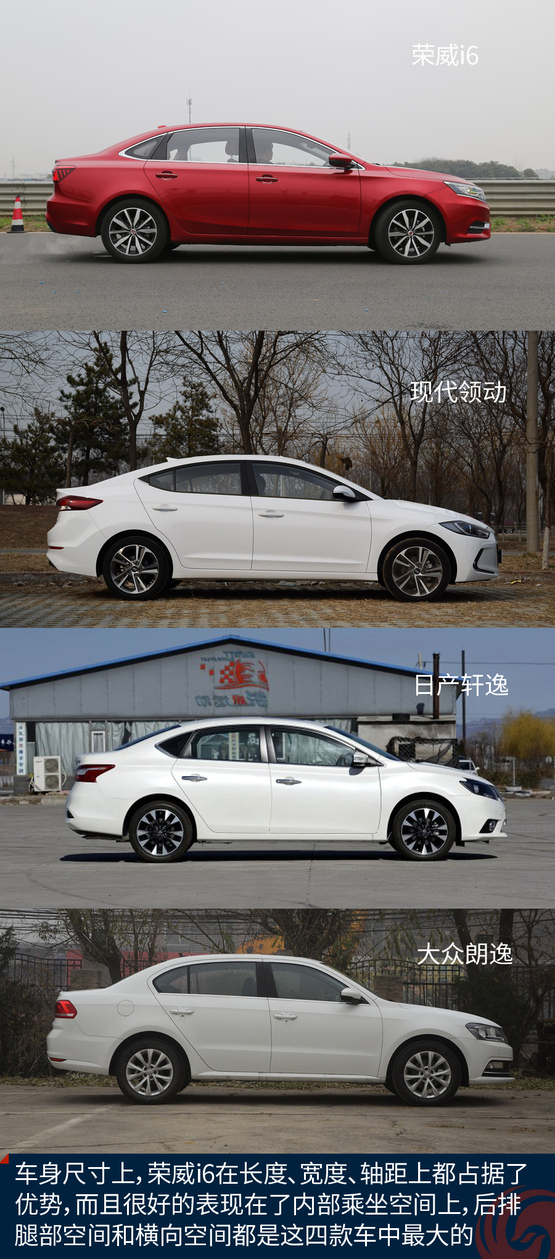 從上面的表格可以看出,榮威i6的長寬高分別為4671*1835*1460mm,在寬度和長度上,都要優(yōu)于其他三款車。特別是車寬,達(dá)到了1835mm,橫向的寬度不僅可以提升視覺效果,對車內(nèi)橫向空間也影響很大,尤其是后排乘坐3人的時(shí)候。在軸距上,榮威i6以2715mm的數(shù)據(jù)表現(xiàn),穩(wěn)居第一位。