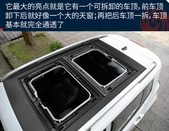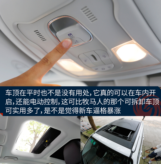 敞篷版車型將普通車型的天窗玻璃全部換成了可拆卸的頂棚,拆卸過程十分方便,即使是女性車主也能輕松拆卸。而且最重要的一點是這個頂棚不只是樣子貨,平時放在車頂時,車內(nèi)可進(jìn)行操作,把它變成一個電動天窗來用,是不是感覺特高端?