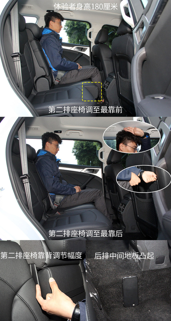 關(guān)于第二排,最重要的當(dāng)然要數(shù)空間了。剛一坐到第二排之后,感覺確實是很寬敞,不僅腿部空間毫無壓力,頭部空間也完全沒有壓抑感,而且,第二排座椅還支持四向調(diào)節(jié),即座椅前后調(diào)節(jié)和靠背角度調(diào)節(jié),在第三排沒人乘坐的情況下,第二排乘客基本可以找到N種舒服姿勢來應(yīng)對長途乘坐。只不過,第二排的中間地板凸起較高,一定程度上影響了中間乘客乘坐的舒適度。