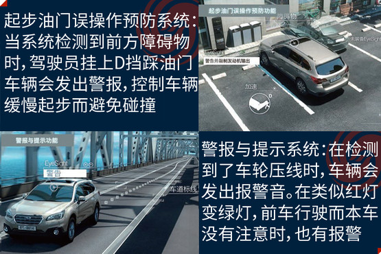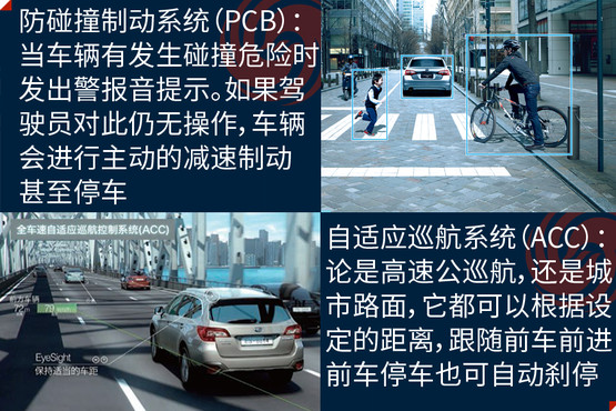 EyeSight駕駛輔助系統(tǒng)是避免事故發(fā)生,此次在中國(guó)市場(chǎng)亮相是它的第三代產(chǎn)品,其主要亮點(diǎn)是通過兩個(gè)模擬人眼的立體攝像頭,來監(jiān)控距離車輛前方100米以內(nèi),高度在1米以上的人、車輛和物體,以減少傷害為目的的駕駛輔助系統(tǒng);除了距離以外,還可以對(duì)方向、高度大小等指標(biāo)進(jìn)行識(shí)別。它的主要功能分為四大類,分別是防碰撞制動(dòng)系統(tǒng)(PCB)、車速自適應(yīng)巡航控制系統(tǒng)(ACC)、起步油門誤操作預(yù)防系統(tǒng)和警報(bào)與提示系統(tǒng)。