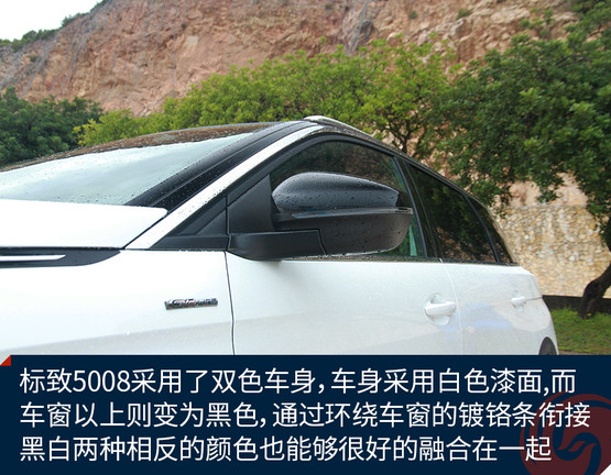 標(biāo)致5008采用了雙色車(chē)身,比如我們?cè)囻{的這一輛GT-Line版車(chē)型,車(chē)身整體采用白色漆面,而車(chē)窗以上的部分則變?yōu)楹谏?,通過(guò)環(huán)繞車(chē)窗的鍍鉻條銜接,黑白兩種相反的顏色也能夠很好的融合在一起。