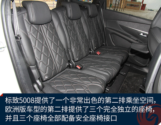 作為一款7座中型SUV,標(biāo)致5008最受關(guān)注的一點(diǎn)就是車(chē)內(nèi)空間的體驗(yàn)了,這里我就來(lái)多講一講。首先,標(biāo)致5008提供了一個(gè)非常出色的第二排乘坐空間,不夸張的說(shuō)2840毫米的軸距基本上就是在為第二排乘客服務(wù)的。歐洲版車(chē)型的第二排提供了三個(gè)完全獨(dú)立的座椅,并且三個(gè)座椅全部配備安全座椅接口,而國(guó)產(chǎn)車(chē)型將會(huì)改為4/6分隔的座椅類型。