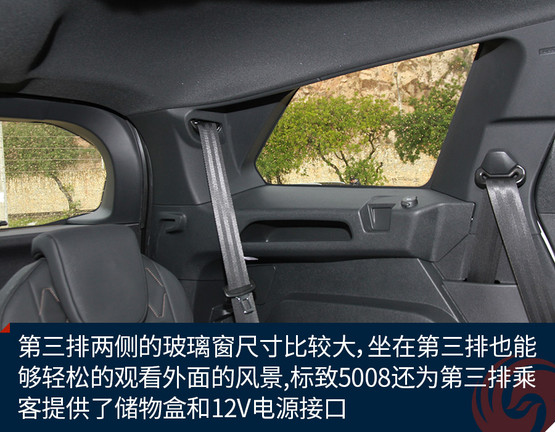 不過(guò)第三排也有值得表?yè)P(yáng)的地方,首先正如前面所說(shuō),由于車(chē)身設(shè)計(jì)的比較方正,所以第三排的頭部空間比較理想,并不覺(jué)得特別頂頭;另外,第三排兩側(cè)的玻璃窗尺寸比較大,坐在第三排也能夠輕松的觀看外面的風(fēng)景;最后,標(biāo)致5008還為第三排乘客提供了儲(chǔ)物盒和12V電源接口,能夠滿足基本的使用需求。
