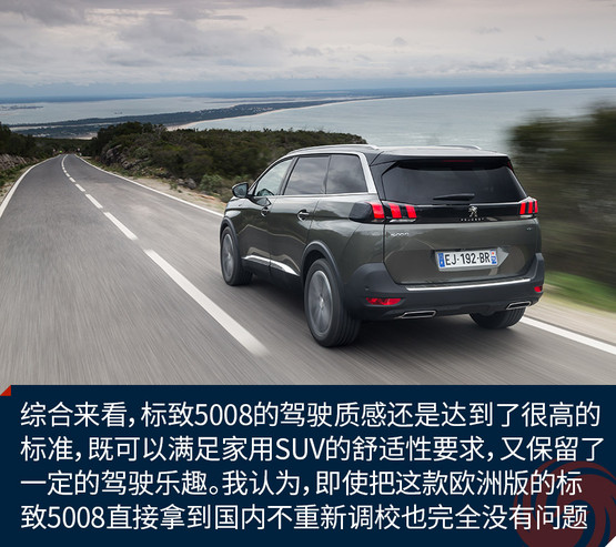綜合來(lái)看,標(biāo)致5008的駕駛質(zhì)感還是達(dá)到了很高的標(biāo)準(zhǔn),既可以滿足家用SUV的舒適性要求,又保留了一定的駕駛樂(lè)趣。我認(rèn)為,即使把這款歐洲版的標(biāo)致5008直接拿到國(guó)內(nèi)不重新調(diào)校也完全沒(méi)有問(wèn)題。