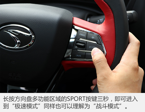 此次DX3 SRG在原有的運(yùn)動(dòng)模式外,還新增了“極速競(jìng)技模式”同時(shí)開(kāi)啟方法也很簡(jiǎn)單,只需要長(zhǎng)摁方向盤(pán)右側(cè)的SPORT按鍵三秒,這時(shí)儀表板會(huì)由白色背光變成紅色,表示已經(jīng)進(jìn)入該模式。