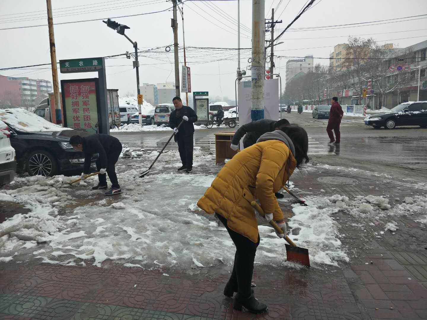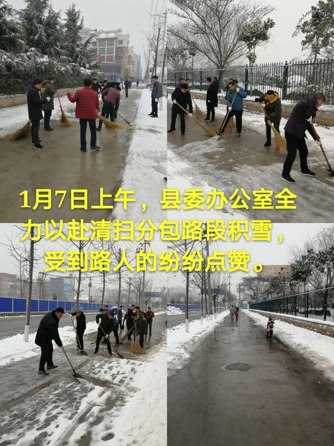 一呼百應(yīng)。該縣縣直各單位、新城、洺南、洺北辦事處,城郊鄉(xiāng)、工業(yè)區(qū)接到通知后,立組織機(jī)關(guān)企事業(yè)單位干部職工上街掃雪、鏟雪,做到本單位出入口、文明城創(chuàng)建責(zé)任區(qū)路面基本無(wú)積冰、殘雪。各辦事處發(fā)揮屬地管理作用,重點(diǎn)發(fā)動(dòng)新華路、迎賓大道、世紀(jì)大道、人民路、育新路、文化路、交通路、科技大道等沿街單位及商戶主動(dòng)落實(shí)“門前三包”,清掃人行道積雪。城管部門從1月5日開(kāi)始一直未停歇,前兩天雖然雪花飄舞,他們冒雪出動(dòng)大型車輛、組織專業(yè)隊(duì)伍,最大程度的保障了主次干道無(wú)積雪、通行順暢。今日,縣城管局按照縣委、縣政府的指示精神,正夜以繼日加大城區(qū)主路行車道路面的清掃力度。在清掃的同時(shí),出動(dòng)各種運(yùn)輸車輛,協(xié)助各單位及時(shí)把中心城區(qū)冰雪清運(yùn)、規(guī)范堆放,確保行人和車輛正常安全通行。