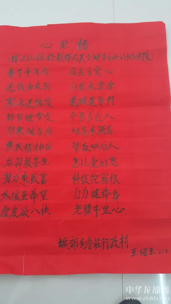 “我推敲了幾個(gè)半夜,寫(xiě)了《心里話——謹(jǐn)以此獻(xiàn)給教體局局長(zhǎng)劉現(xiàn)營(yíng)和他的扶貧團(tuán)隊(duì)》這首五言排律,表表我和老伴及全村對(duì)您的感激之情?!薄捌拮邮瓴。珠L(zhǎng)多愛(ài)心。送錢(qián)米油面,自來(lái)水津津。寒冬送棉被,送炭至柴門(mén)。訪貧健步走,平易又近人?!蓖踅B玉聲情并茂地朗讀著,劉局長(zhǎng)爽朗地笑了,“老伴劉桂蘭藥按時(shí)吃了嗎?”“按時(shí)吃了,多虧您,到我家宣講扶貧政策,幫助我聯(lián)系有關(guān)單位,我老伴享受了慢性病醫(yī)保?!薄肮鹛m說(shuō),人家劉局長(zhǎng)隔三差五給咱送米面油,逢年過(guò)節(jié)給咱送慰問(wèn)金,前幾天頂風(fēng)冒雪送來(lái)兩床被子,一年不知來(lái)了多少趟,待咱比親人還親啊!我家也沒(méi)有什么拿出手的,我倆一合計(jì),就發(fā)揮我的一點(diǎn)專(zhuān)長(zhǎng),給您寫(xiě)了首詩(shī),您經(jīng)常去我家噓寒問(wèn)暖,我今個(gè)也來(lái)您這,算是走走親戚吧,回報(bào)回報(bào)您!”