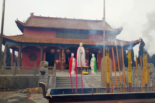 在西華這片古老又神秘的土地探尋盤(pán)古女?huà)z創(chuàng)世文化,自然少不了拜謁昆山女?huà)z宮。這座宮殿位于西華縣昆山辦事處山子頭村,因?yàn)閭髡f(shuō)這里是女?huà)z的居住地,所以在西華人心目中有著不可替代的地位。2018年元旦前夕,我們驅(qū)車前往,進(jìn)入山子頭村一路西行直達(dá)盡頭,女?huà)z宮就赫然于眼前了。待記者在宮門(mén)前站定,不經(jīng)意回望來(lái)路,竟發(fā)現(xiàn)眼前是一條坡度明顯的下坡路。見(jiàn)記者詫異,一旁的村民笑著說(shuō):“山子頭嘛,就是說(shuō)這里是山嶺的頭兒,女?huà)z宮就在最頂上?!?/p>