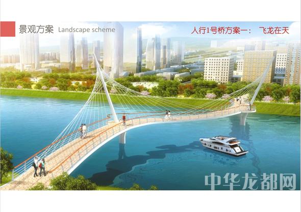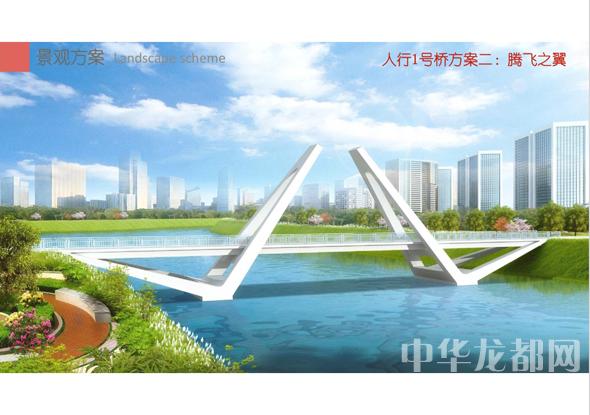 人行1號(hào)橋的設(shè)計(jì)方案有兩套,分別為“飛龍?jiān)谔臁焙汀膀v飛之翼”。“飛龍?jiān)谔臁睘殡p塔斜拉橋。記者從效果圖中看到,該橋呈現(xiàn)出優(yōu)美的線條,宛如一條長(zhǎng)龍騰空在天?!膀v飛之翼”為V腿連續(xù)鋼箱梁橋。記者從效果圖中看到,橋體簡(jiǎn)潔流暢,時(shí)尚現(xiàn)代,橋墩形成穩(wěn)固的三角形,像兩只燕子展翅高飛。
