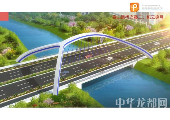 泰山路橋的設(shè)計(jì)方案有兩套,分別為“錚錚鐵骨”和“梳云掠月”。“錚錚鐵骨”為下承式系桿拱橋。記者從效果圖中看到,其拱體骨架給人一種力量感,拱身視線通透,簡(jiǎn)潔明快?!笆嵩坡釉隆睘殇摻罨炷撂峄@拱橋。記者從效果圖中看到,該橋的拱圈造型獨(dú)特,簡(jiǎn)潔又不失大氣。