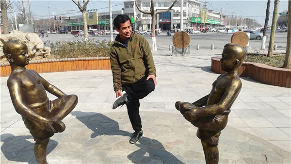 在表現(xiàn)兒童游戲“斗雞”的雕塑前,兩個(gè)光背孩童獨(dú)腿站立,分別搬著另一條腿作戰(zhàn)斗準(zhǔn)備。那生動(dòng)的畫面,令40多歲的市民尚巖青忍俊不禁,他也獨(dú)腿站在雕塑中間,像個(gè)開心的孩子一樣,搬著腿和雕塑中的頑童組成一起斗雞的場(chǎng)景。