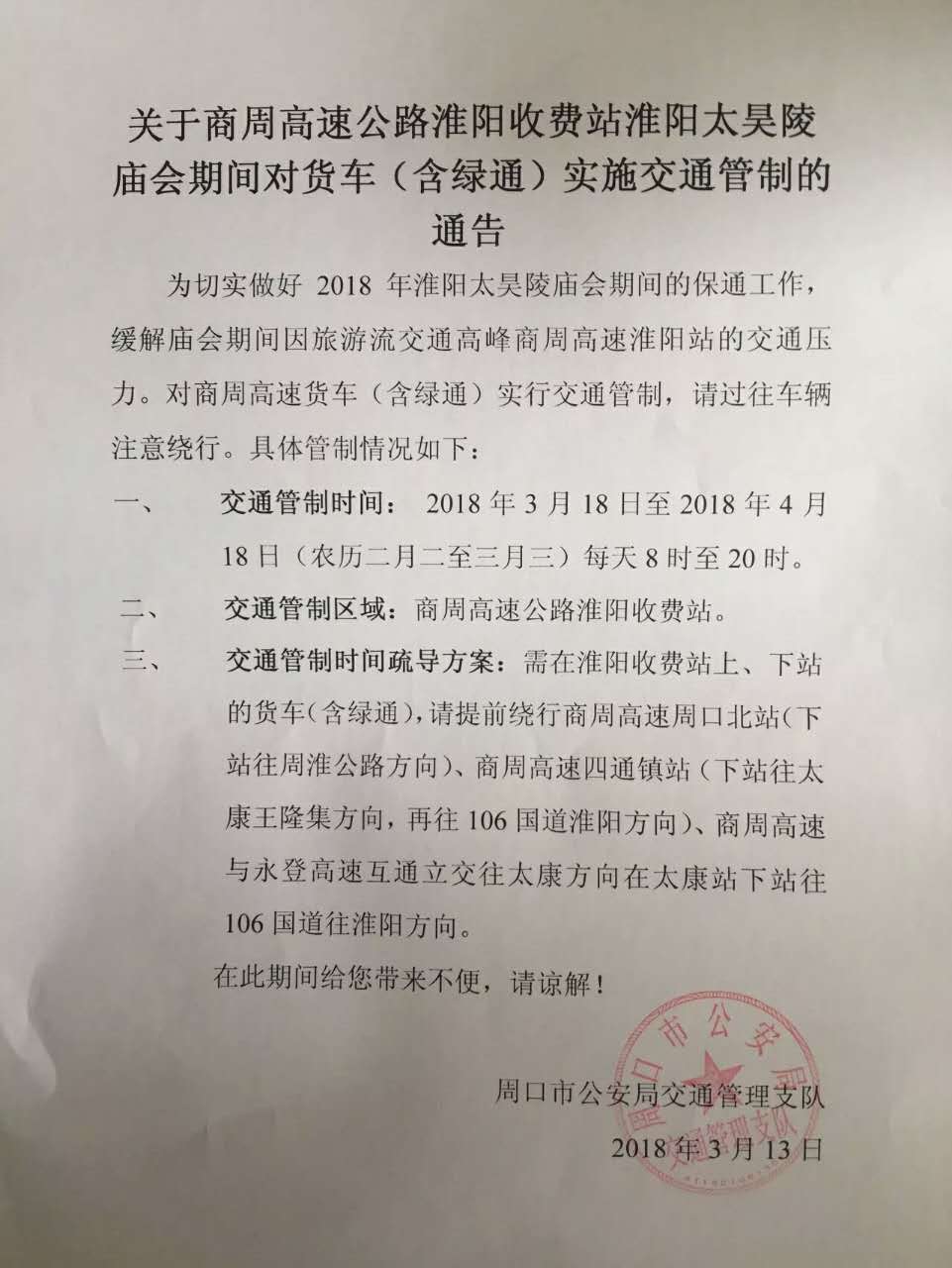 貨車司機(jī)請(qǐng)注意!二月廟會(huì)期間,淮陽(yáng)高速口實(shí)行交通管制
