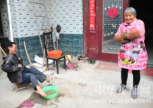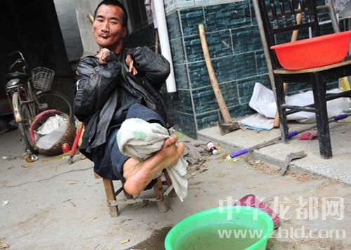 “這孩子40多年來,沒住過院,沒打過針,頭疼發(fā)燒會(huì)給媽媽示意,拿幾片藥一吃就好,這孩子命硬,一冬天也不洗回澡,到夏天爸爸媽媽幫他洗洗,有時(shí)候衣服一月才換一次?!编従訌埓髬屨f道?,F(xiàn)在紅印可以靈活的用雙腳幫媽媽做一些事情了。