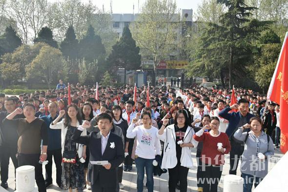 上午八點(diǎn)半,400余名學(xué)生衣著整潔,佩戴紅領(lǐng)巾,手握自備白花,排著整齊的隊伍從學(xué)校出發(fā),懷著對烈士無限崇敬的心情來到周口烈士陵園,佇立在傲然聳立的烈士紀(jì)念碑前,莊嚴(yán)肅穆的悼念活動開始了。升國旗、唱國歌、敬隊禮,黨員教師在烈士紀(jì)念碑前重溫入黨誓詞,少先隊員代表向烈士墓敬獻(xiàn)花圈,全體師生向烈士鞠躬默哀。