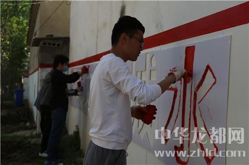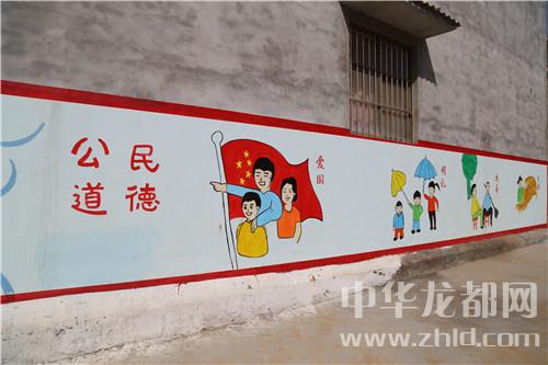 當(dāng)日16時許,記者在該村看到,干凈整潔的水泥路像玉帶在村中盤旋,街道兩側(cè)栽植不久的小樹在向人們招手,坑塘四周干凈整潔,綠樹環(huán)繞,塘水清澈,梳理有致,房前屋后干凈整潔……天空中雖然下著雨,但是記者遠遠的就聽到了群眾的談笑聲和機械的轟鳴聲,走近,原來是村民們不顧天氣下雨,依然在自發(fā)地進行道路清理工作。記者看到,該村墻體文化更讓村子增加了很多的“內(nèi)涵”。