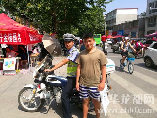 6月7日下午2時20分,周口市公安局交通管理支隊一大隊民警宋智偉和同事正在位于市區(qū)人民路附近的周口市第二高級中學門口路段疏導交通,因為臨近開考,現場車流量較大。突然一名考生走到宋智偉面前,請求宋智偉幫他攔停車輛載送他回家拿東西?!爱敃r,這名考生語速很快,看起來很緊張。通過詢問得知,他的考試用品和證件遺忘在家里,我當時就選擇駕駛咱們的高考應急服務警用摩托車載送他回家去取考試物品?!彼沃莻フf。
