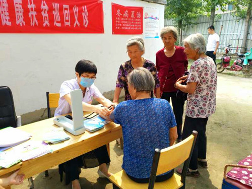 8時(shí)40分許,醫(yī)護(hù)人員在文莊社區(qū)衛(wèi)生室的醫(yī)務(wù)人員的協(xié)助下搭起了臨時(shí)義診臺(tái),為村民測(cè)血糖、量血壓,并針對(duì)測(cè)量結(jié)果給出用藥指導(dǎo),為村民提供健康咨詢服務(wù),現(xiàn)場(chǎng)解答健康問題,并根據(jù)部分村民身體狀況提出合理的防治建議。