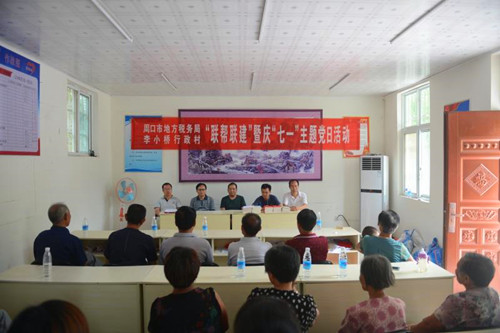 中華龍都網(wǎng)訊(周口報(bào)業(yè)全媒體記者 馬治衛(wèi) 通訊員 蘇童)為喜慶中國共產(chǎn)黨建黨97周年,夯實(shí)貧困村基層組織基礎(chǔ),促進(jìn)脫貧攻堅(jiān)工作深入開展,按照中共周口市委組織部和周口市直工委要求,6月26日上午,周口市地稅局組織相關(guān)科室負(fù)責(zé)人走進(jìn)幫扶村太康縣王集鄉(xiāng)李小村行政村開展“黨建聯(lián)幫聯(lián)建暨慶七一主題黨日”活動。這是該局在幫扶村“兩委”成功換屆之后第一次舉辦主題黨日活動,市、縣、鄉(xiāng)各級領(lǐng)導(dǎo)及駐村工作隊(duì)和幫扶村30余名黨員代表參加了此次活動。