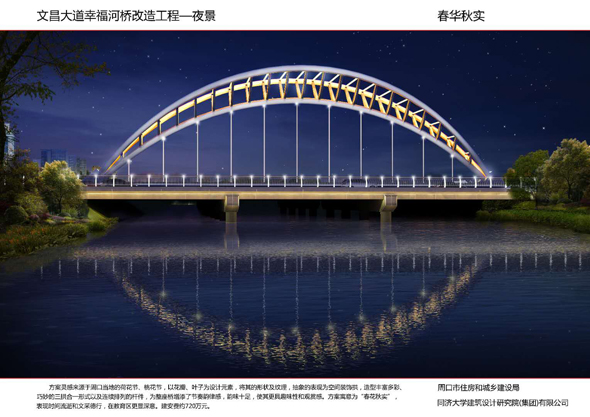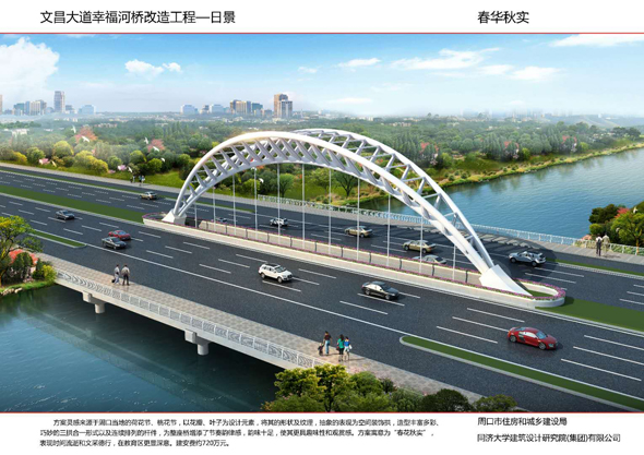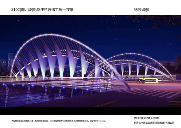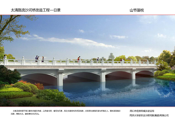 周口大道沙潁河橋景觀改造,設計造型簡單柔美,如行云流水,同時與沙潁河景觀帶相融合,給城市增添了生機與活力。周口大道賈東干渠橋以荷葉為設計元素,造型簡約而不失細節(jié)。周口大道流沙河橋造型簡潔大氣,線條流暢,像一條青龍游弋在水面上。文昌大道幸福河橋以花瓣、葉子為設計元素,造型豐富多彩。文昌大道流沙河故道橋在中分帶位置修建花壇,花壇造型莊重古樸,景石造型端莊沉穩(wěn)。太清路流沙河橋以古建斗拱、窗花為元素,造型儒雅大方。太清路洼沖溝2號橋以“輻轂相依”為名,既融合環(huán)境,又有團結、合作的寓意。太清路賈魯河橋,增加了景觀造型,使人們可以重溫當年賈魯河的美好畫卷。彭新莊橋以柳葉為元素,預示著留住賓客與送別親友的不舍之情的雙重含義。