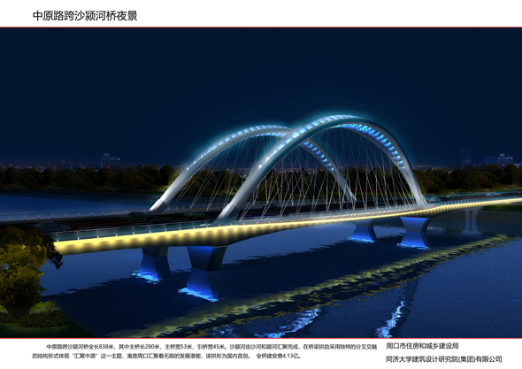 這次集中開工的14座橋梁,包含中原路跨沙潁河橋新建工程,流沙河大成路橋、洼沖溝政通路橋、洼沖溝人和路橋、流沙河騰飛路橋新建工程,以及9座老橋梁景觀改造工程,均位于城市主次干道的重要節(jié)點,總投資5.6億元。其中,新建的中原路跨沙潁河大橋是其中最大的工程,橋長837米,橋寬45米,建安費投資估算4.2億元,建成后,沙潁河南北通行更加順暢。
