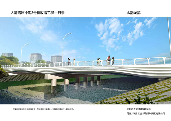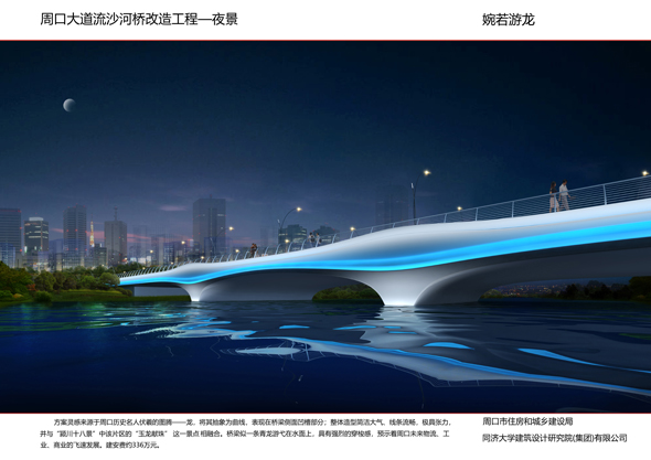 中原路跨沙潁河大橋,橋型采用下承式組合拱橋,遠看像一輪新月,展現出了“一輪明月照古城”的美景。洼沖溝政通路橋以”振翅高飛的翅膀“為造型元素,在新建人行道橋內側采用鋼結構塑造翅膀造型,同時對人行橋營造出廊道的意境。洼沖溝人和路橋以“太極魚”為設計元素,體現“天人合一”。流沙河騰飛路橋拱圈外傾,形似一只翩翩起舞的蝴蝶。流沙河大成路橋兼具現代鋼橋和傳統(tǒng)拱橋的美感,充分體現周口厚重的歷史文化。