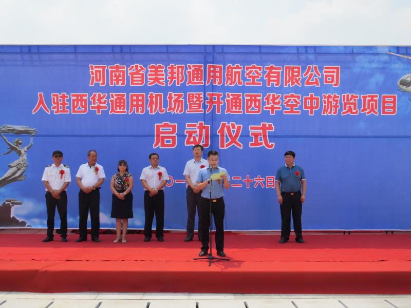 8月26日,河南省美邦通用航空有限公司入駐西華通用機(jī)場(chǎng)暨開(kāi)通西華空中游覽項(xiàng)目啟動(dòng)儀式在西華縣南廣場(chǎng)舉行,西華縣委常委、常務(wù)副縣長(zhǎng)王獻(xiàn)超,西華縣人大常委會(huì)副主任龐友敬,西華經(jīng)開(kāi)區(qū)管委會(huì)主任宋廣良,西華經(jīng)濟(jì)技術(shù)開(kāi)發(fā)區(qū)城市投資有限公司總經(jīng)理朱洪江;美邦控股集團(tuán)總經(jīng)理、河南省美邦通用航空有限公司董事長(zhǎng)王洪濤等出席啟動(dòng)儀式。