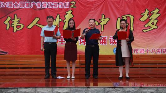 周口十八中、鄲城第二實(shí)驗(yàn)中學(xué)舉辦了推普周誦讀比賽,在比賽中學(xué)校倡議全體師生立即行動(dòng)起來(lái),從自身做起,從現(xiàn)在做起,人人講普通話,時(shí)時(shí)講普通話,處處講普通話。扶溝縣實(shí)驗(yàn)小學(xué)舉行了推普周主題升旗儀式,向?qū)W生介紹了推廣普通話和使用規(guī)范字的意義。據(jù)了解,周口市各縣區(qū)都開(kāi)展了相應(yīng)的主題班會(huì)、書(shū)法比賽、街頭宣傳等推普周主題活動(dòng)。