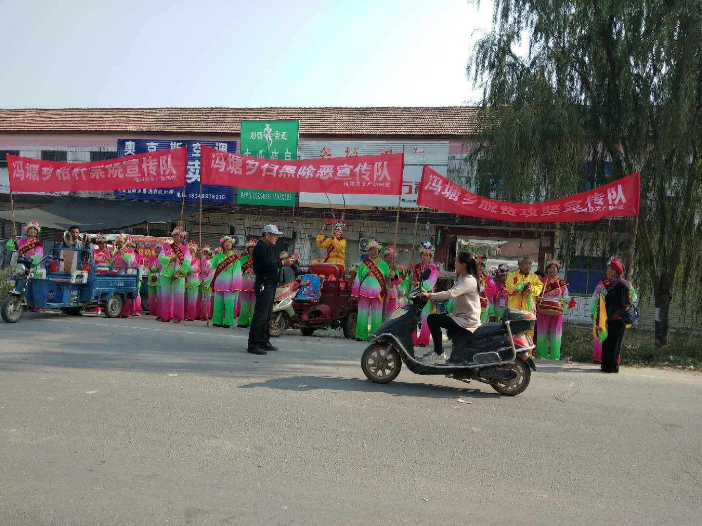 馮塘鄉(xiāng)脫貧攻堅(jiān)、秸稈禁燒、掃黑除惡三支宣傳隊(duì)進(jìn)行宣傳。