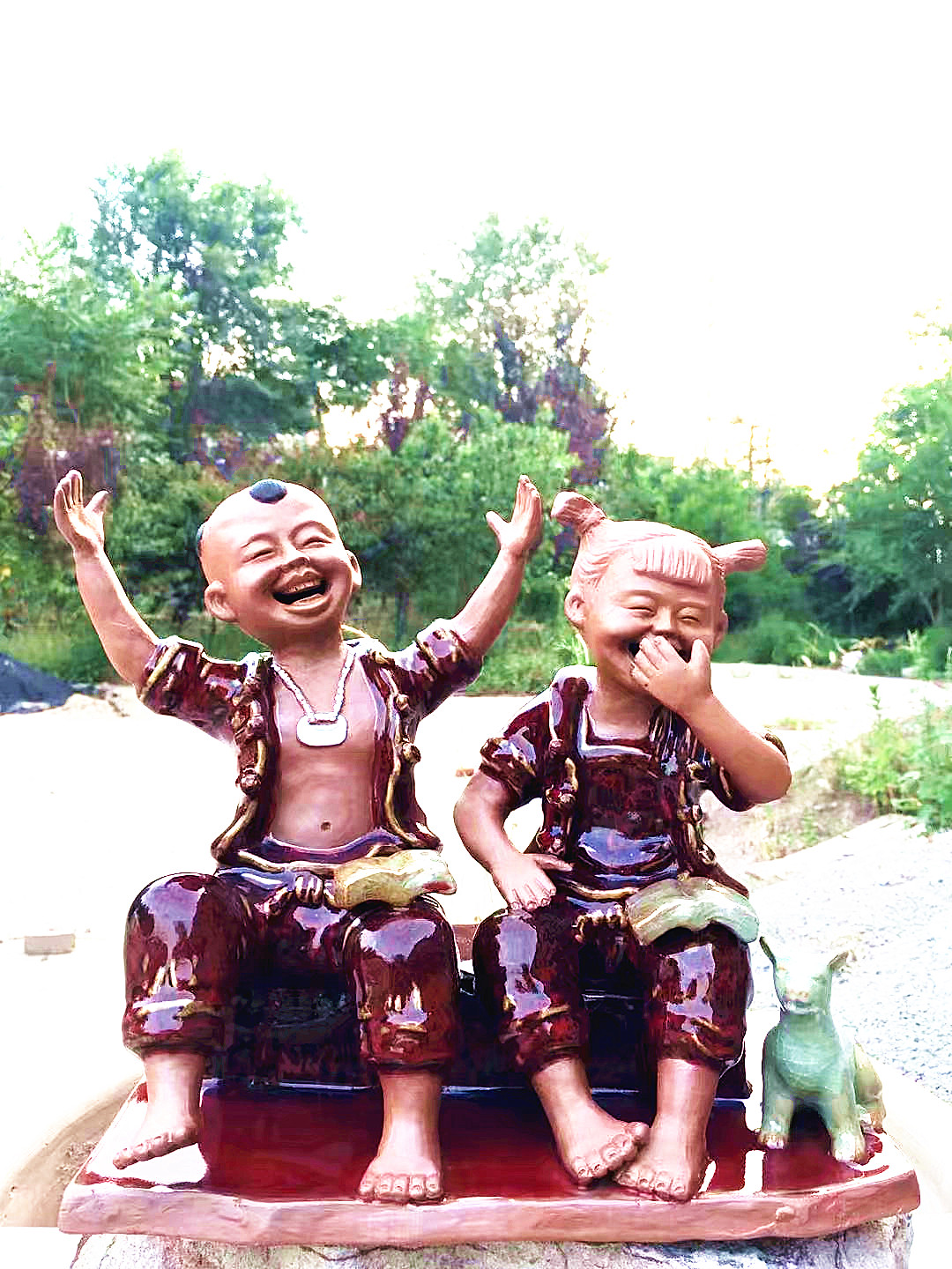 記者采訪獲悉,張振福鈞瓷泥塑作品《童話故事》,表現(xiàn)的是豫東農(nóng)村的孩子看書的情景,畫面中小男孩講述書中的童話故事,手舞足蹈,逗得小女孩開懷大笑,表現(xiàn)童真、童趣,畫面充滿著喜慶祥和,從側(cè)面反映了豫東人民的幸福生活。作品長39厘米、寬23厘米高36厘米,是張振福把泥塑和鈞瓷完美結合、使用鈞瓷礦泥,泥塑局部上釉,更具觀賞性。