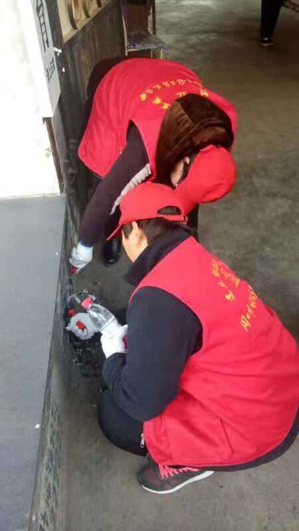 為了加快清理的速度,有的志愿者兩兩搭班,一個人用瓶裝水噴在小廣告處,另一個則趕忙用抹布進(jìn)行擦拭。別小瞧這些小廣告,清理起來很費(fèi)時、費(fèi)力,有時候一個小廣告需要花費(fèi)五、六分鐘的時間才能清理干凈,讓人累的手臂酸麻。