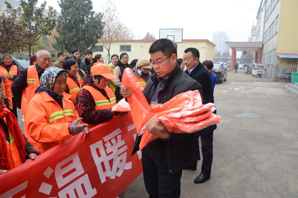 近日寒流來襲,氣溫驟降,連續(xù)的低溫降雨天氣讓人感受到了冬天的寒冷,為了確??h城區(qū)環(huán)境衛(wèi)生干凈整潔,廣大環(huán)衛(wèi)工人們始終堅持冒嚴(yán)寒每天起早貪黑打掃城區(qū)衛(wèi)生,默默無聞堅守在工作一線。12月3日,西華縣媧城商會會長黃鳳芝攜手愛心企業(yè)山西汾酒集團(tuán)代理商宋二領(lǐng)來到城管局向環(huán)衛(wèi)工人捐贈一批環(huán)衛(wèi)保潔防寒服,在寒冷冬天為堅守縣城區(qū)保潔一線的每位環(huán)衛(wèi)工人送去溫暖。