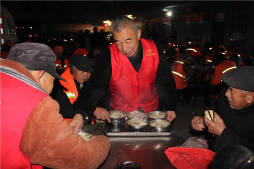 志愿者王剛負責維護現場秩序,6點10分準時開飯,志愿者按豎排整體端送,環(huán)衛(wèi)工人8人一桌,通道暢通,現場就像農村吃大席一般、好不熱鬧。