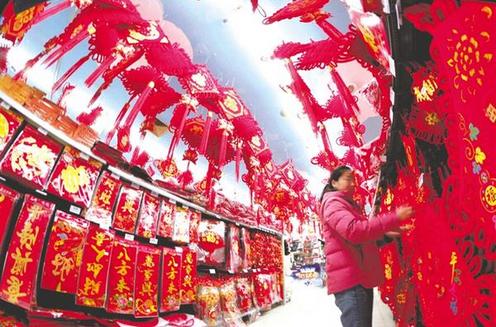 記者近日采訪看到,周口的年貨市場(chǎng)已經(jīng)開啟,年畫市場(chǎng)最先吹起紅火的節(jié)日風(fēng),紅彤彤的對(duì)聯(lián)、中國結(jié)等被商家掛滿店鋪,吸引客人上門。記者 梁照曾 攝
