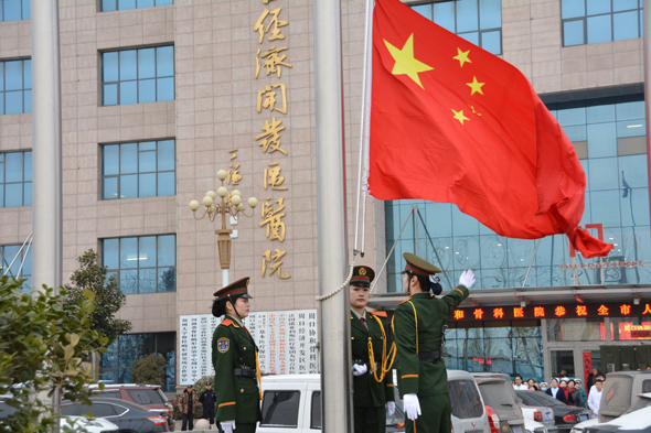 2月10日,正月初六,年后開工的好日子。在嚴(yán)格的“禁放令”下,周口城區(qū)沒有了“開門炮”的喧囂,卻有著更有意義的慶祝方式。圖為周口協(xié)和骨科醫(yī)院隆重舉行升國旗儀式,全面啟動節(jié)后工作,并祝愿祖國新年好運(yùn)。 記者 李偉 攝