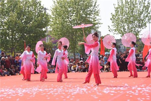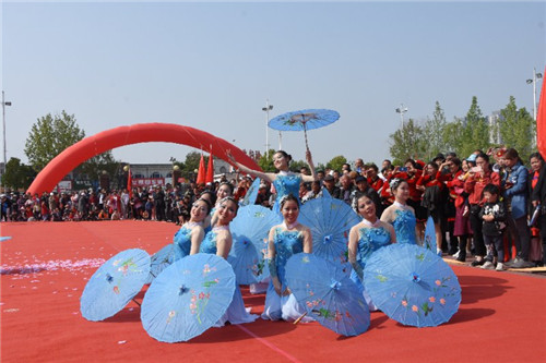 比賽進(jìn)行到將近一半時(shí)候,縣第二實(shí)驗(yàn)小學(xué)參賽隊(duì)帶來的舞蹈《麗人行韻》將大賽推向了高潮。表演開始,身著天藍(lán)漸變色長(zhǎng)裙的38名姑娘手持彩傘一字列隊(duì)緩步入場(chǎng),正當(dāng)觀眾們看得入神時(shí),她們突然將彩傘都齊刷刷地舉過頭頂并瞬間打開,無數(shù)粉紅色的花瓣從彩傘中紛紛飄落,像從碧藍(lán)的天空中下起了無盡的花瓣雨。選手們短短幾秒鐘的舉動(dòng),在廣場(chǎng)上勾勒出了一個(gè)人間仙境,引人入勝。在粉紅花瓣的映襯中,傘下腳步輕盈的女子們微微舞動(dòng),美若天仙,婀娜多姿,展現(xiàn)了“人面桃花相映紅,桃花依舊笑春風(fēng)”的作品主題。