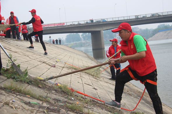 當天上午,志愿者拿著掃帚、鐵锨等工具,對堤坡的塑料袋、礦泉水瓶等垃圾進行清理,還有一些志愿者負責清理河堤上的垃圾。雖然垃圾雜物又臟又臭,但是志愿者相互協(xié)作,干得熱火朝天。