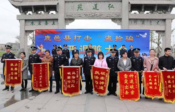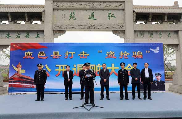 4月25日上午,鹿邑縣召開打擊“盜搶騙”專項行動公開退贓大會??h委常委、政法委書記侯自峰出席會議并講話??h公、檢、法、司等有關(guān)部門負責(zé)人與群眾代表近300人參加退贓大會。