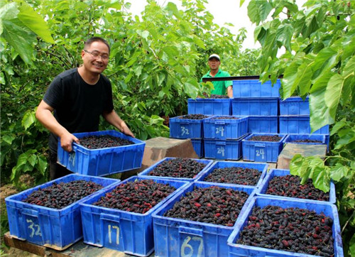 除此之外,桑果的采摘全靠人工,是勞動密集型產(chǎn)業(yè),需要大量當?shù)氐膭趧恿Γ康讲烧竟?jié),公司都會招用周邊200余名村民到種植基地務工,僅此一項,為每名務工人員人均增收3000余元?!鞍吃谝嫫飞i┓N植基地采摘桑椹,每天都有100多元的收入?!苯衲?3歲的黃橋鄉(xiāng)孫堤村留守婦女趙美容高興的說。