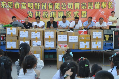 當日下午,廣東東莞富明鞋材有限公司董事長黃宗昆為母校薛廟小學師生捐贈愛心運動鞋儀式在馬頭鎮(zhèn)薛廟小學舉行。馬頭鎮(zhèn)中心校副校長李永長、中心校辦公室主任章紅勝、薛廟行政村黨支部書記黃志華等村兩委領(lǐng)導、校長黃景思、名譽校長孫道紅、全校260 多名師生及部分學生家長600多人參加了當天的捐贈儀式。