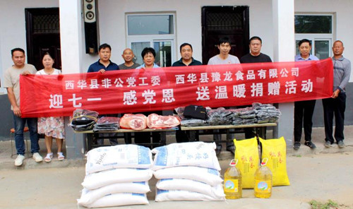 5月28日,西華縣非公黨工委聯(lián)合愛心企業(yè)開展“迎七一、感黨恩、送溫暖”捐贈活動,西華縣非公黨工委書記李永民帶領(lǐng)非公黨工委工作人員、西華縣豫龍食品有限公司經(jīng)理李會霞,以及部分非公企業(yè)黨支部書記,為黃橋鄉(xiāng)敬老院送去了價值5000余元的衣服、豬肉、面粉、米、食用油等物品。