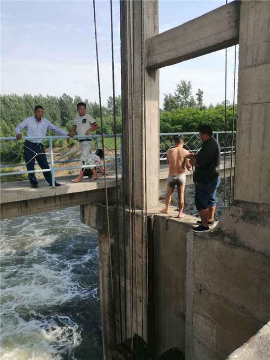 黃興龍邊大聲對(duì)青年男子說(shuō)“堅(jiān)持住,我去拿工具”,邊向100多米外的閘管所跑去。參加過(guò)縣水利局預(yù)防未成年人溺亡培訓(xùn)學(xué)習(xí)的所長(zhǎng)劉浩和職工魏全心、王相等聽(tīng)到喊聲,立即從辦公室拿來(lái)繩索、長(zhǎng)竹竿等救援設(shè)備,和黃興龍一起跑向出事地點(diǎn)。